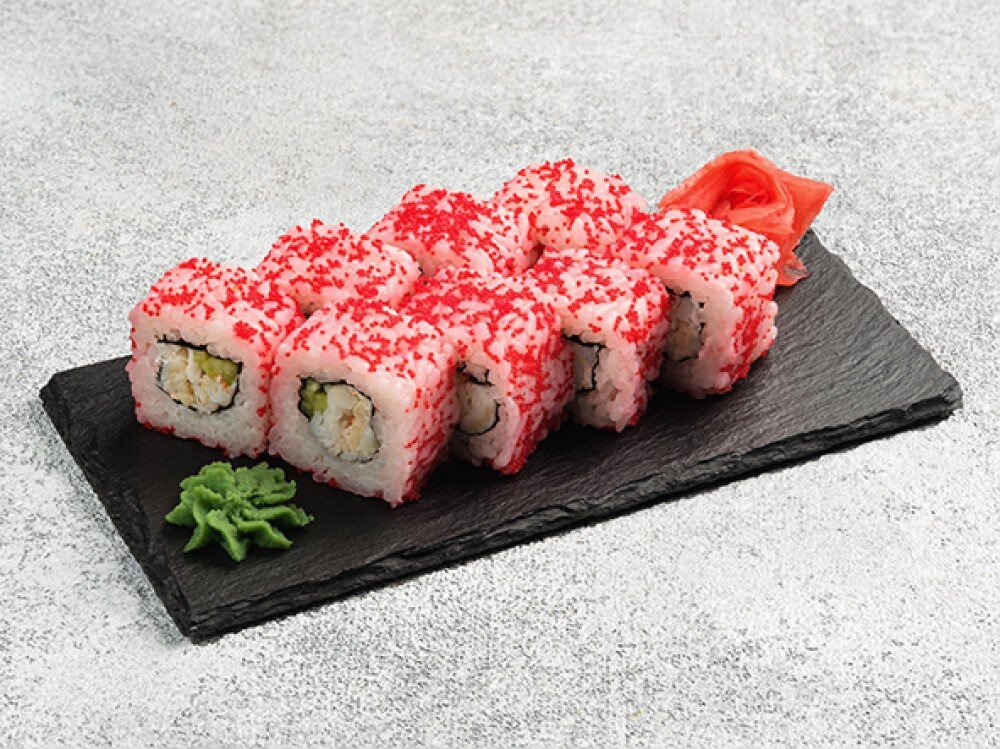 Рис, нори, имитация краба, майонез, огурец, тобико