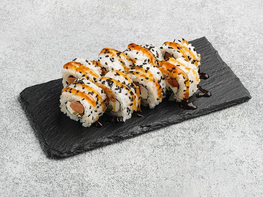 Рис, нори, семга, сыр творожный, огурец, соус терияки, кунжут