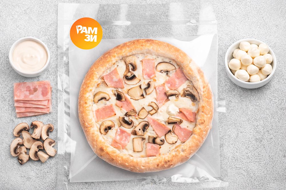 Готовая пицца шоковой заморозки. Разогрев в духовке до 180 градусов, получаете горячую пиццу с хрустящим бортом, как в кафе из печи! Соус сливочный, сыр моцарелла, ветчина, шампиньоны.
